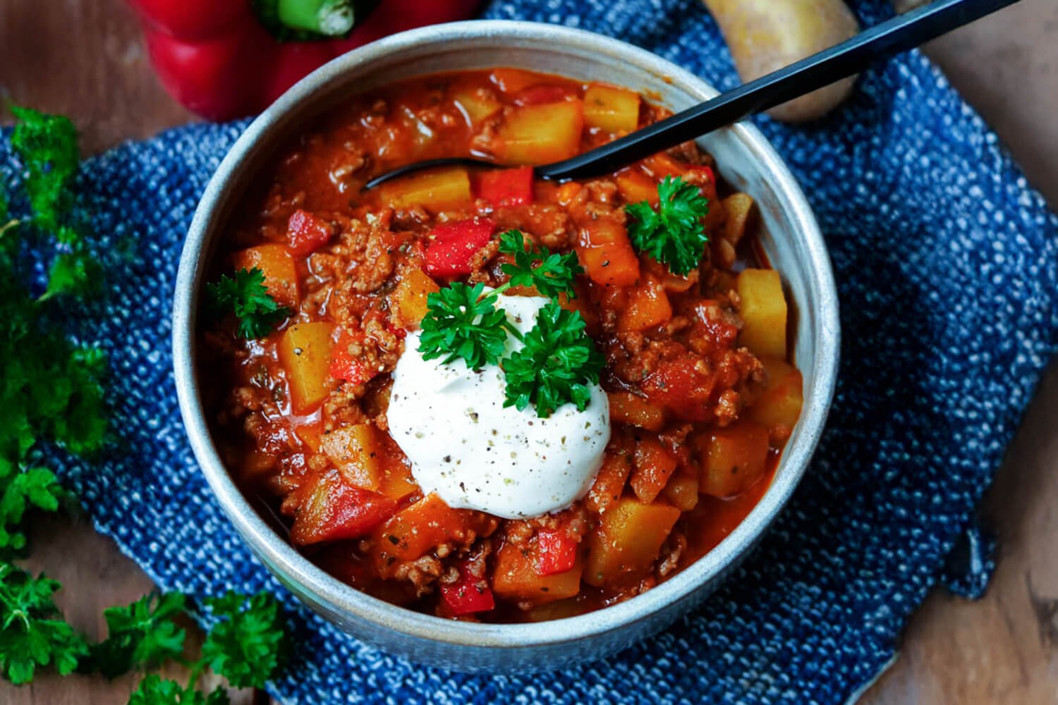 A hearty German stew made with ground beef, potatoes, paprika, and a rich tomato-based broth. (Source: https://www.gaumenfreundin.de/bauerntopf-mit-hackfleisch/)