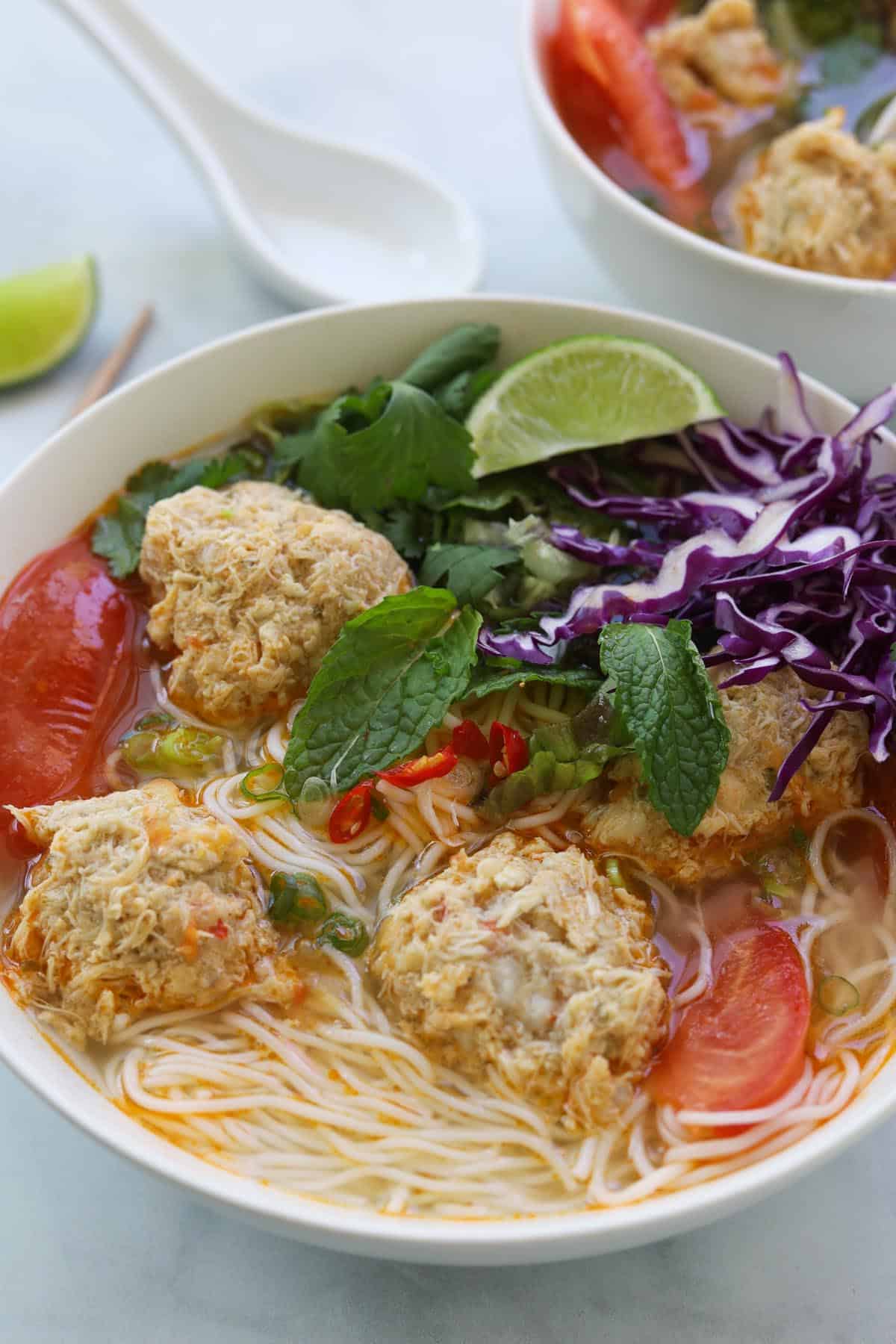 - Ladle hot broth, crab rieu, and tomatoes over the noodles; top with herbs, greens, lime, and serve with fish sauce, chilies, and any optional toppings.